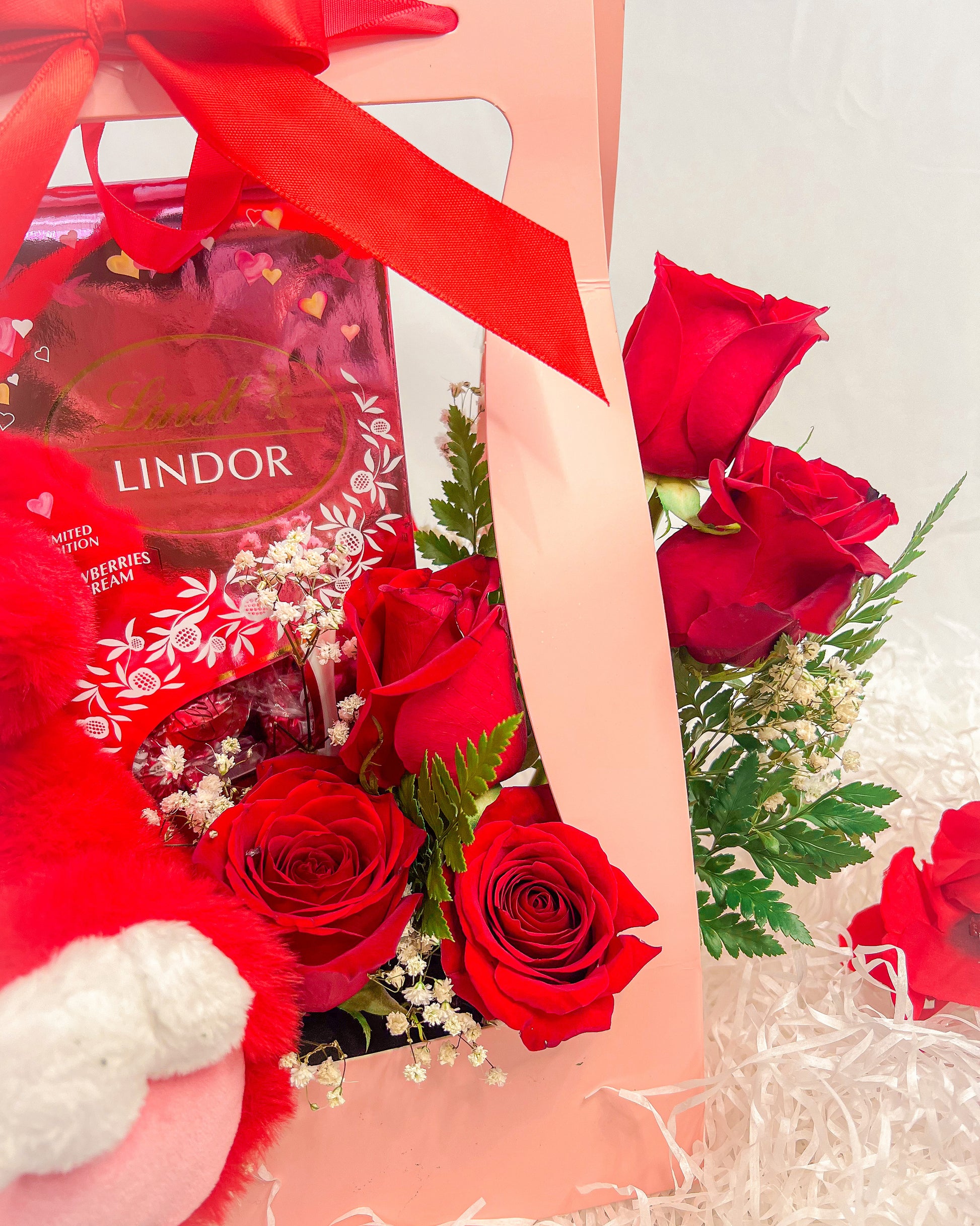 Roses, Lindor chocolate, valentines teddy bear arrange in envelope