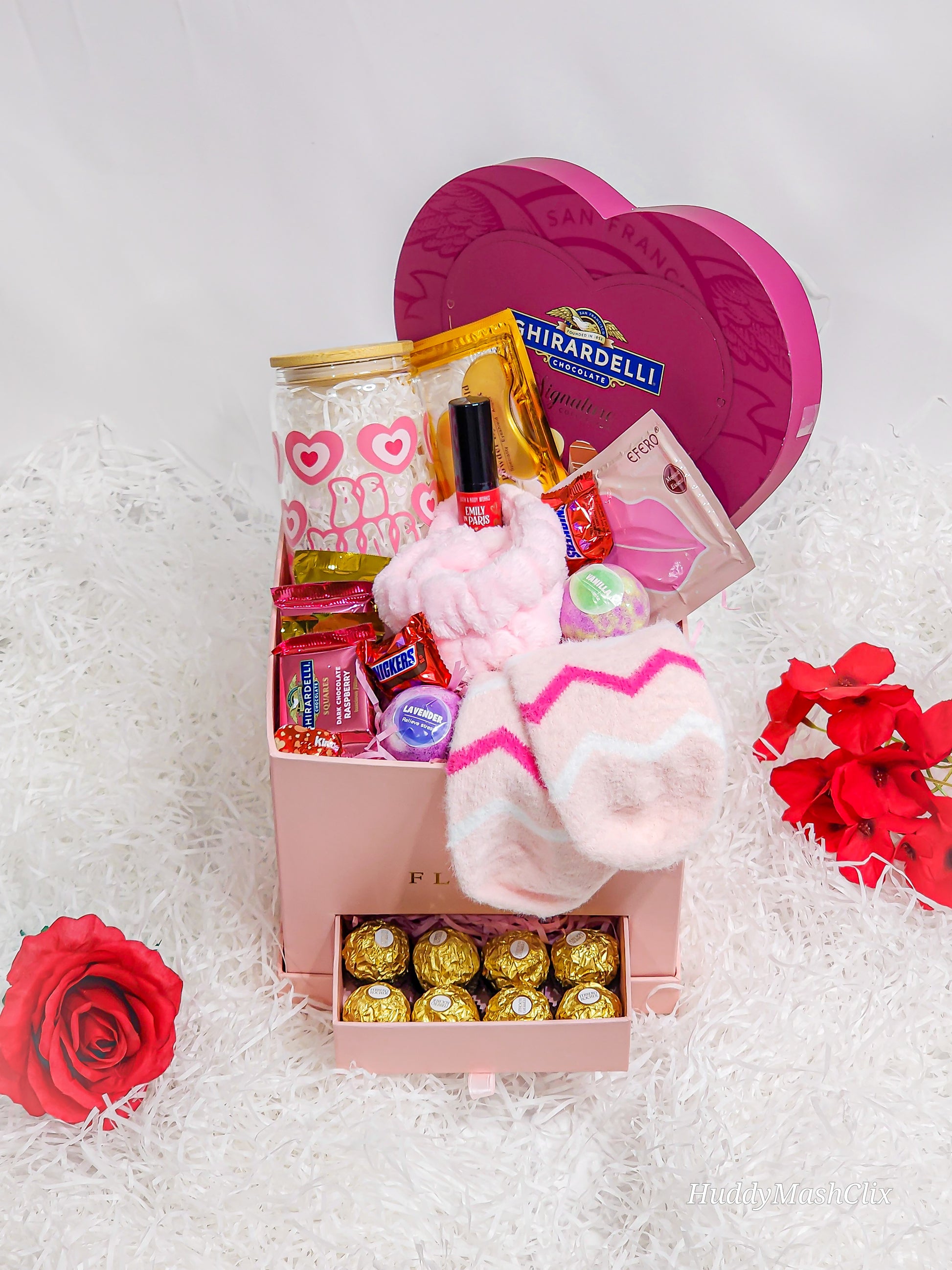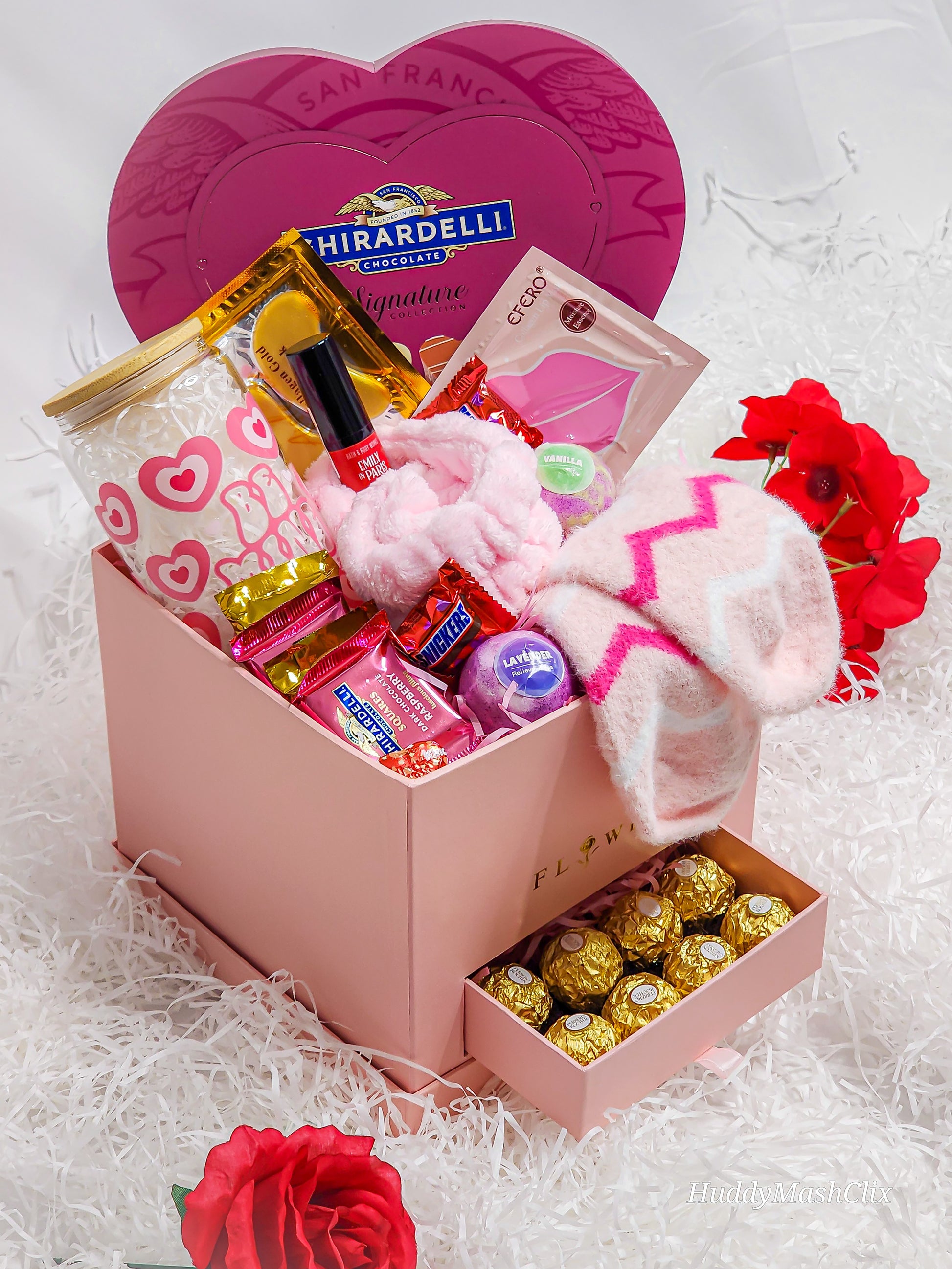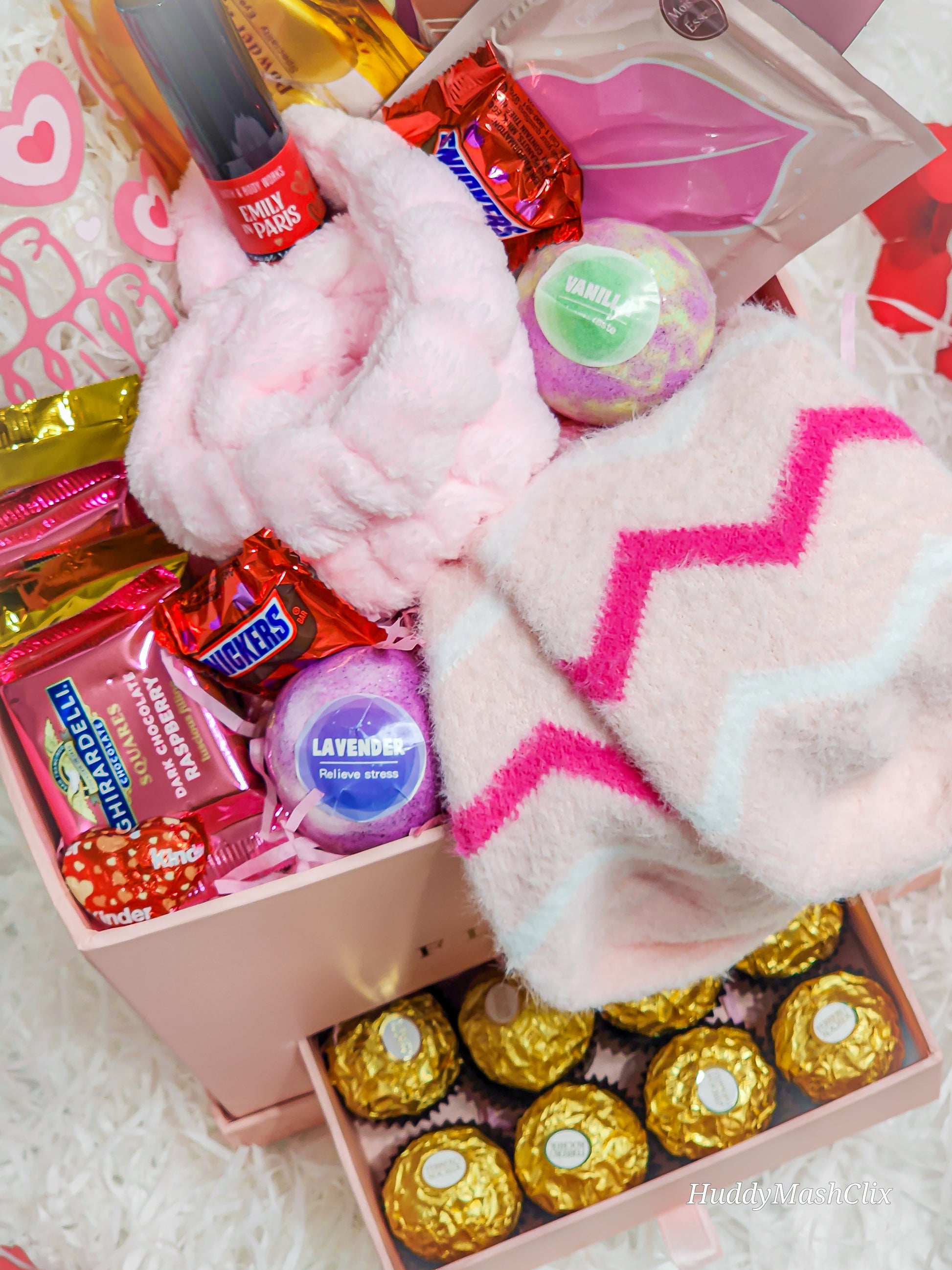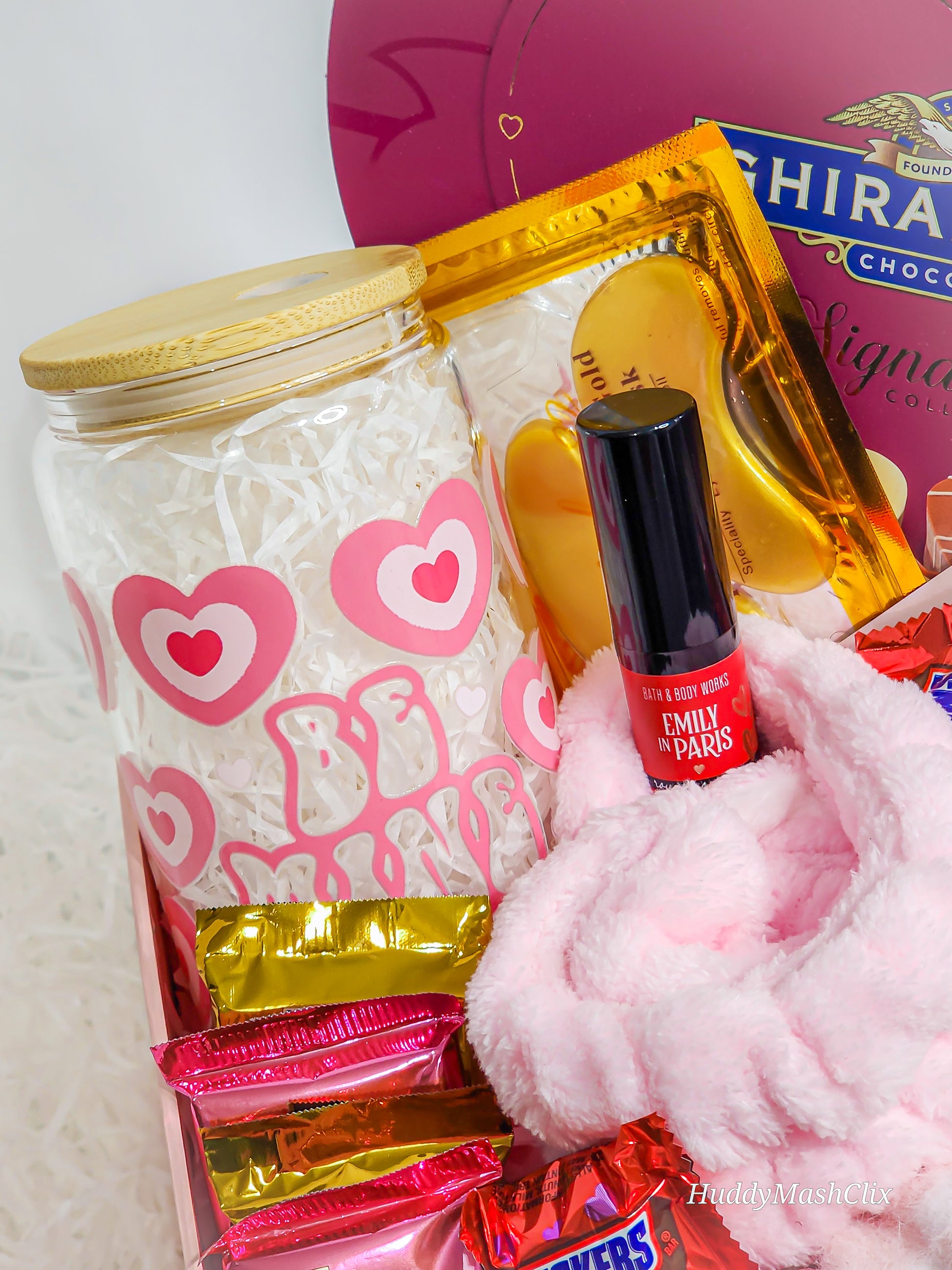 docs, glass can, eye mask, lip mask, Emily in Paris lipstick, chocolate, make up hairband and bath bomb